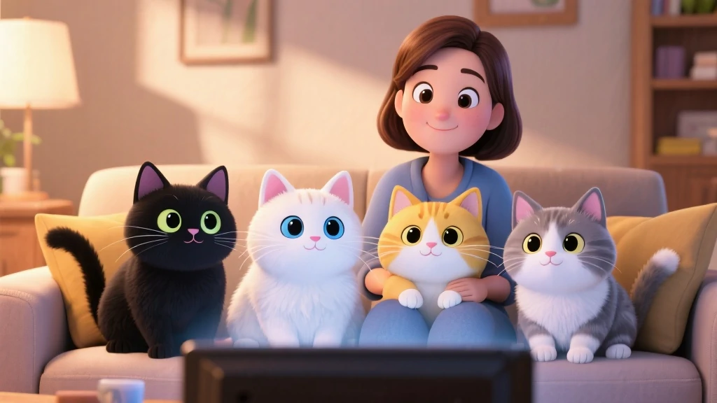 提示词:“女孩和四只猫咪拍全家福,从左到右依次是黑猫,白猫,橘猫,灰猫”