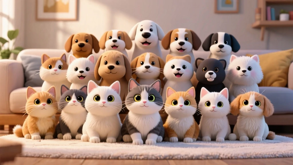 提示词:“许多小动物一起拍全家福,最前排是猫咪”